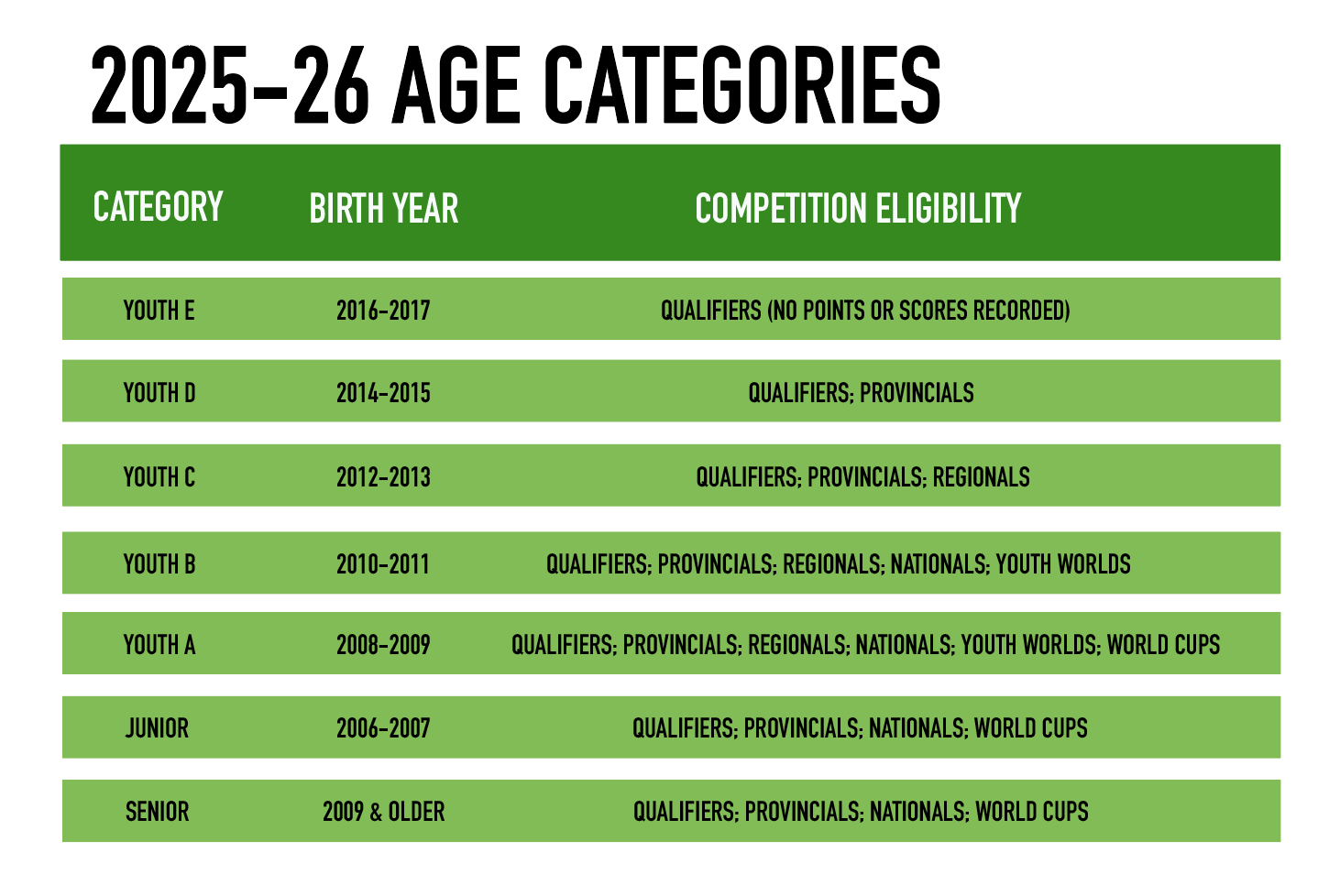 A competitor’s birth year determines who they compete against and what competitions they can attend. As climbers get older, they can compete at different levels of competition which includes Provincials, Regionals, Nationals and beyond. Your age for the category is determined by how old you will be on December 31, 2026 for the 25-2026 season.